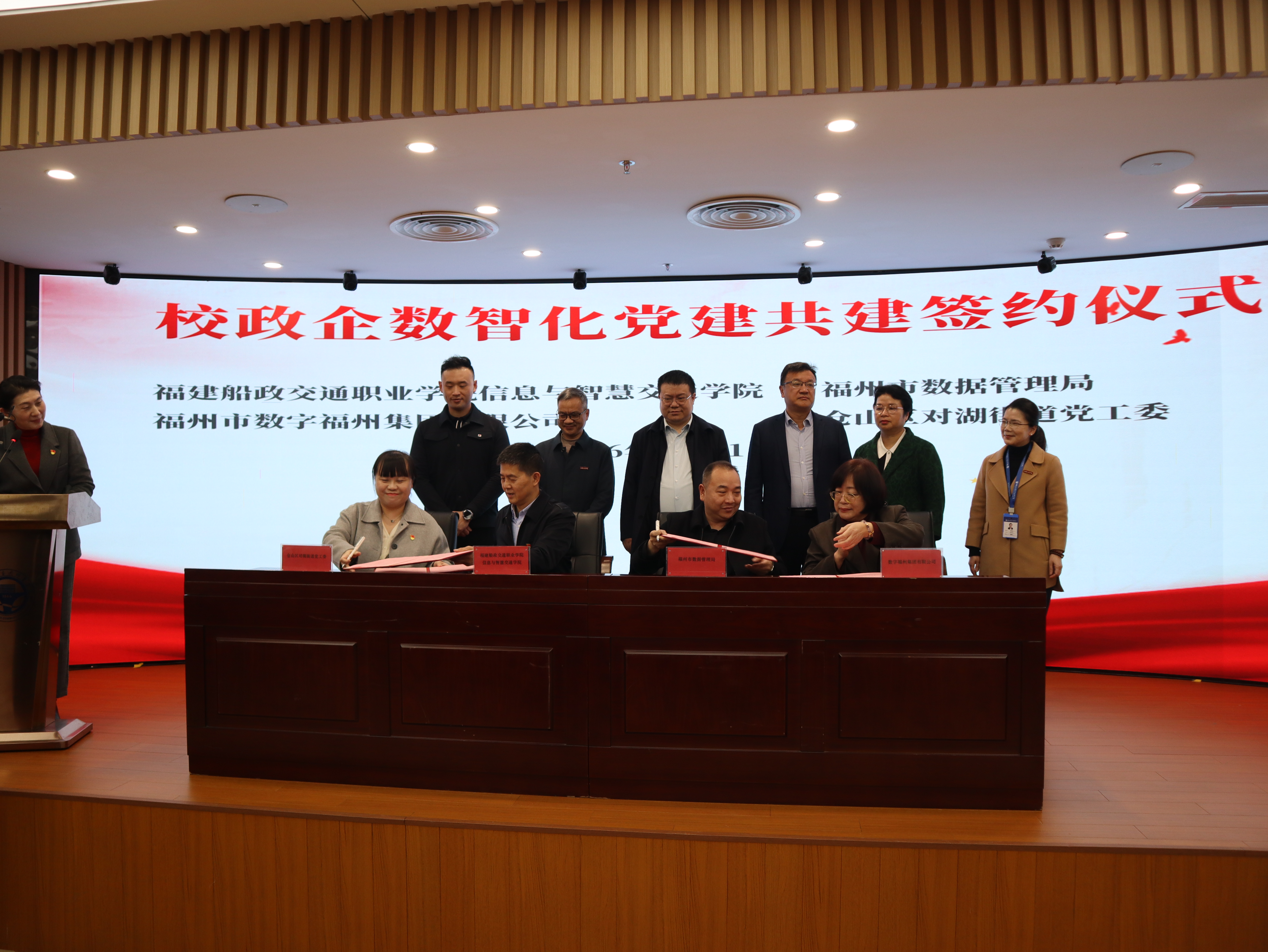 来自福建船政交通职业学院、福州市数据管理局、数字福州集团有限公司、仓山区对湖街道的党员代表举行四方党建共建签约仪式,共同签署《党建共建协议书》,围绕“数智赋能基层治理”设立联合攻关课题。