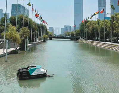 通过远程操控设置好作业任务,无人清洁船便沿着预定线路作业,不一会儿就满载水草和漂浮物顺利返航,环卫工人无需下水,只需在岸边倾倒垃圾筐即可。电量低了,无人船也会自主返航、充电,再投入作业。
