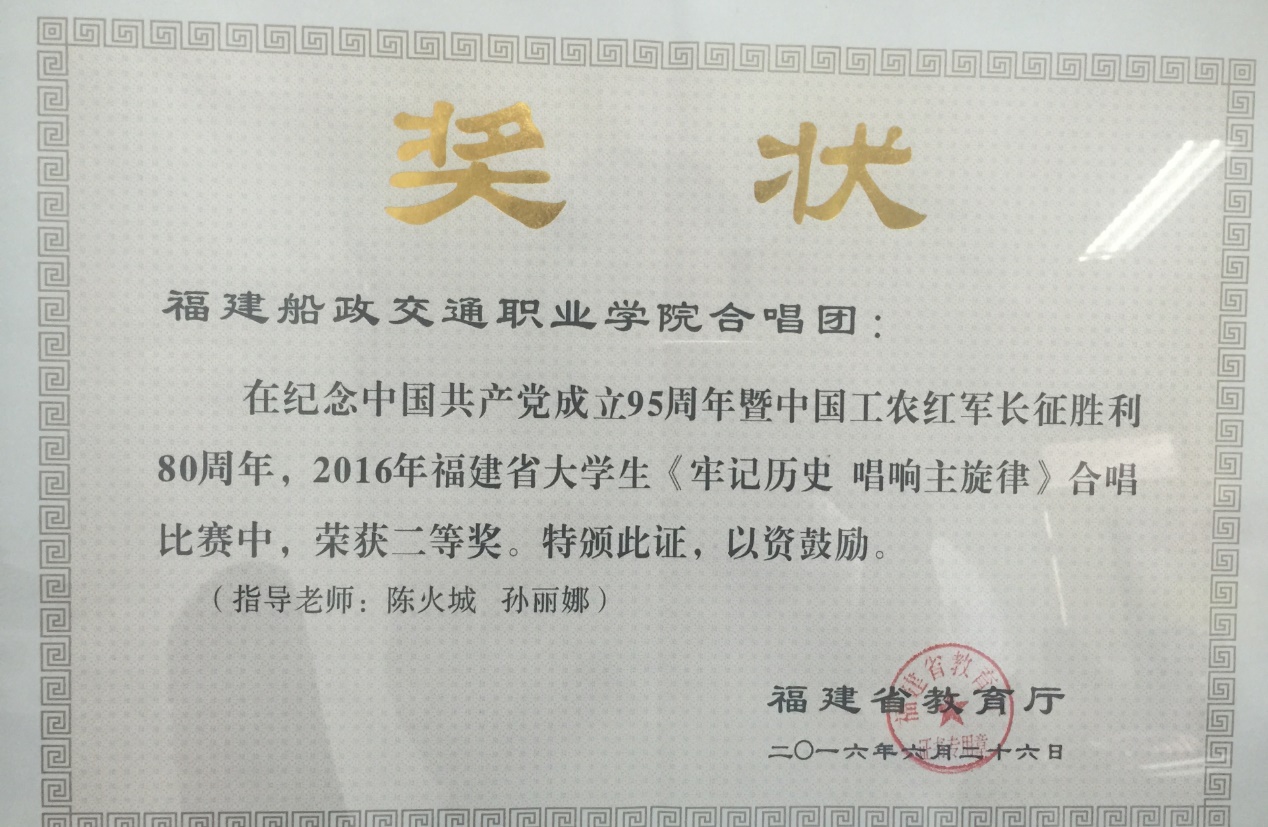 在庆祝中国共产党成立95周年暨中国工农红军长征胜利80周年,2016年福建省大学生《牢记历史 唱响主旋律》合唱,荣获二等奖。
