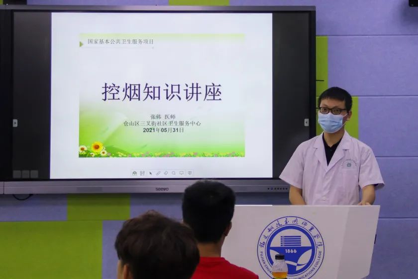 仓山区三叉街社区卫生服务中心张伟医师带来的控烟知识讲座,向同学们普及了烟草中含有的有害物质、吸烟对人体产生的影响、危害及产生的疾病等有关知识。