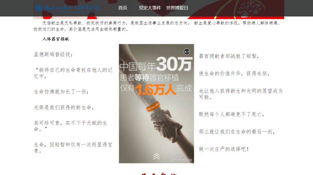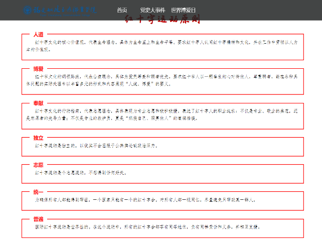通过对党史的学习,我们更好的了解过去,以革命先辈的崇高精神为追求,我校红十字会学生分会于5月1日-10日开展“学史崇德,博爱载物”网页设计比赛,本次活动共收到船政学子投稿作品40份。有力推动学习党史氛围,在践行社会主义核心价值观中,弘扬“人道、博爱、奉献”的红十字精神。