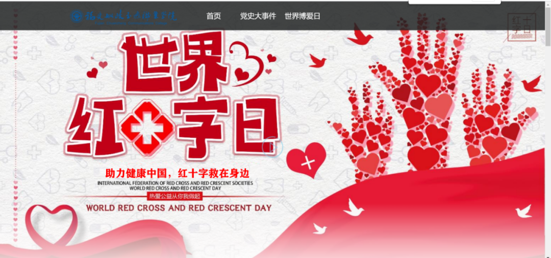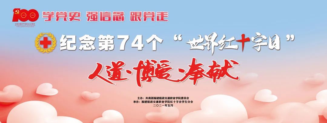 2021年5月8日是第74个“世界红十字日”,为推动党史学习教育深入开展,大力营造良好舆论环境,动员更多社会力量参与和支持红十字事业,以优异成绩庆祝中国共产党成立100周年,提高全校师生社会责任感和使命感,营造健康良好的校园生活环境,福建船政交通职业学院红十字会学生分会在学校党委领导和团委指导下,组织开展2021年第74个“世界红十字日”主题系列活动。此次活动包括线上知识答题、志愿者培训、红十字日校园活动、青春健康教育学习培训会、女性健康知识讲座、防震减灾逃生演练、海报设计、急救知识进社区、暖心抒写送祝福、网页设计比赛、鸿儒养老乐园志愿服务等十二项活动。