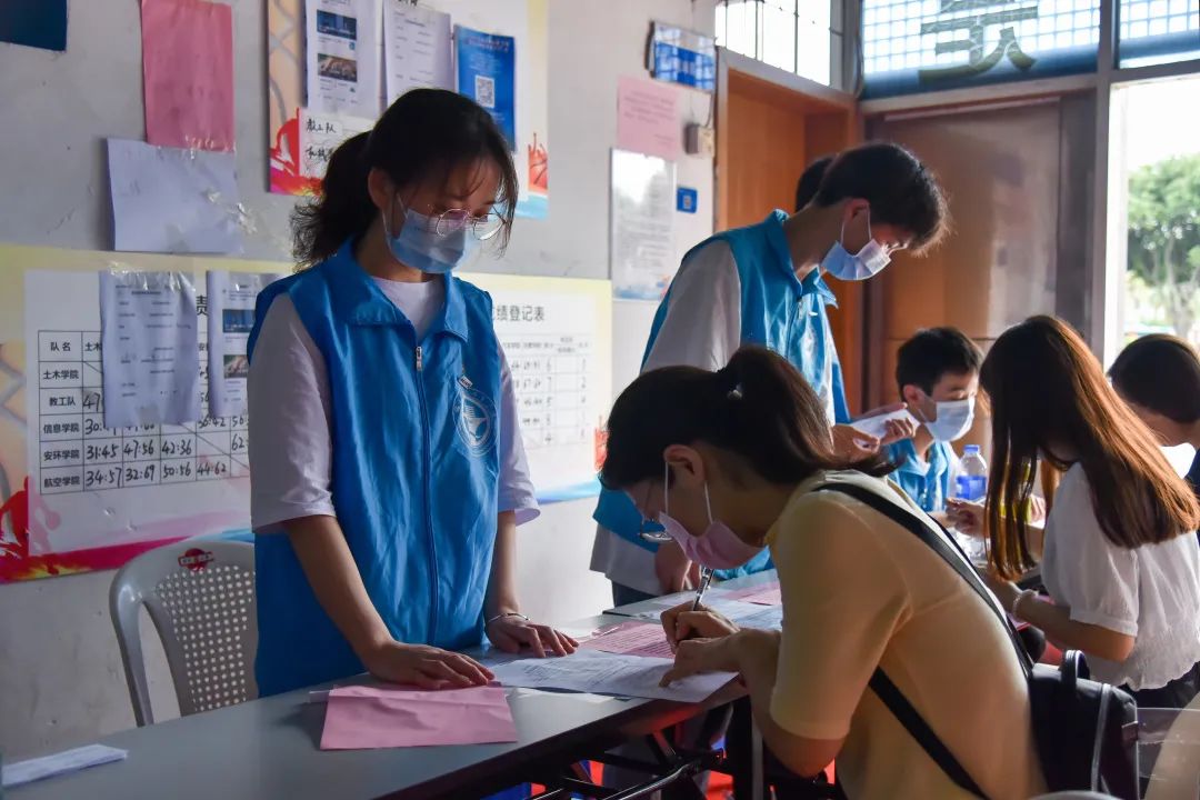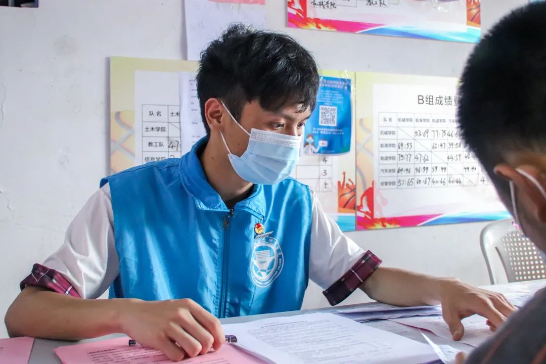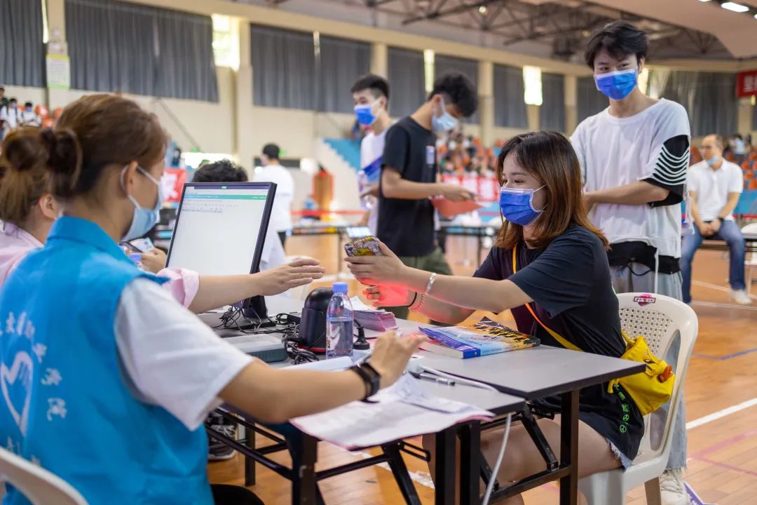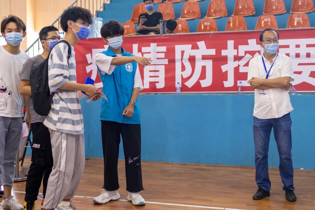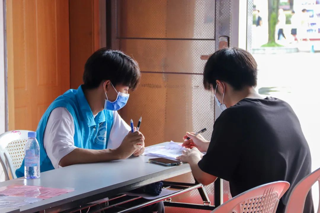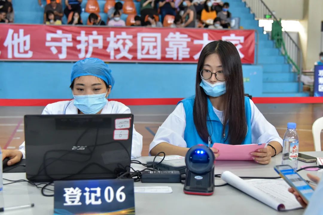 志愿者提醒师生出示接种预约登记信息,协助填写登记单、维护现场秩序、耐心解答师生们对于接种新冠疫苗流程的疑问,为疫苗接种工作把好第一道“关口”。