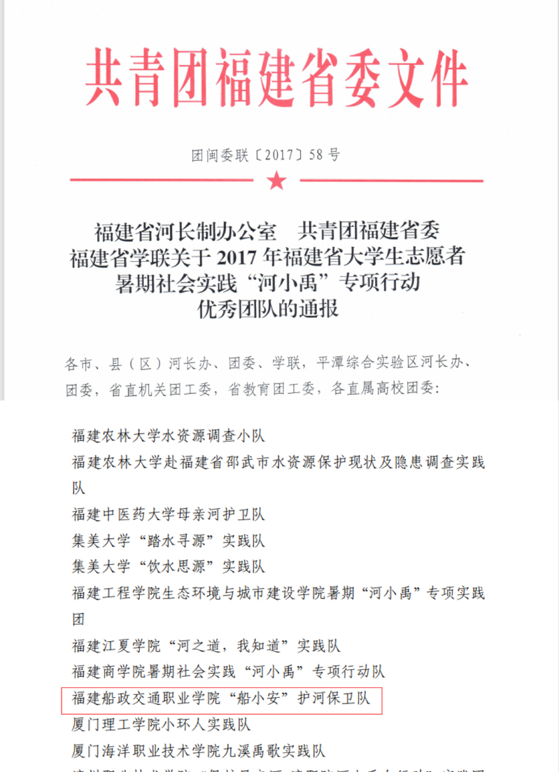 2017年福建省大中专学生志愿者暑期社会实践“河小禹”专项行动优秀团队