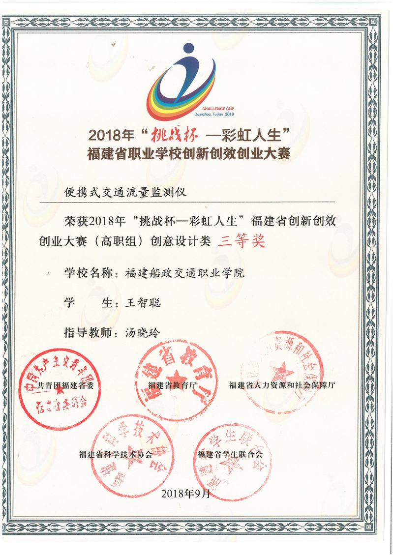 便携式交通流量监测仪获2018“挑战杯-彩虹人生”福建省创新创效创业大赛(高职组)创意设计类三等奖