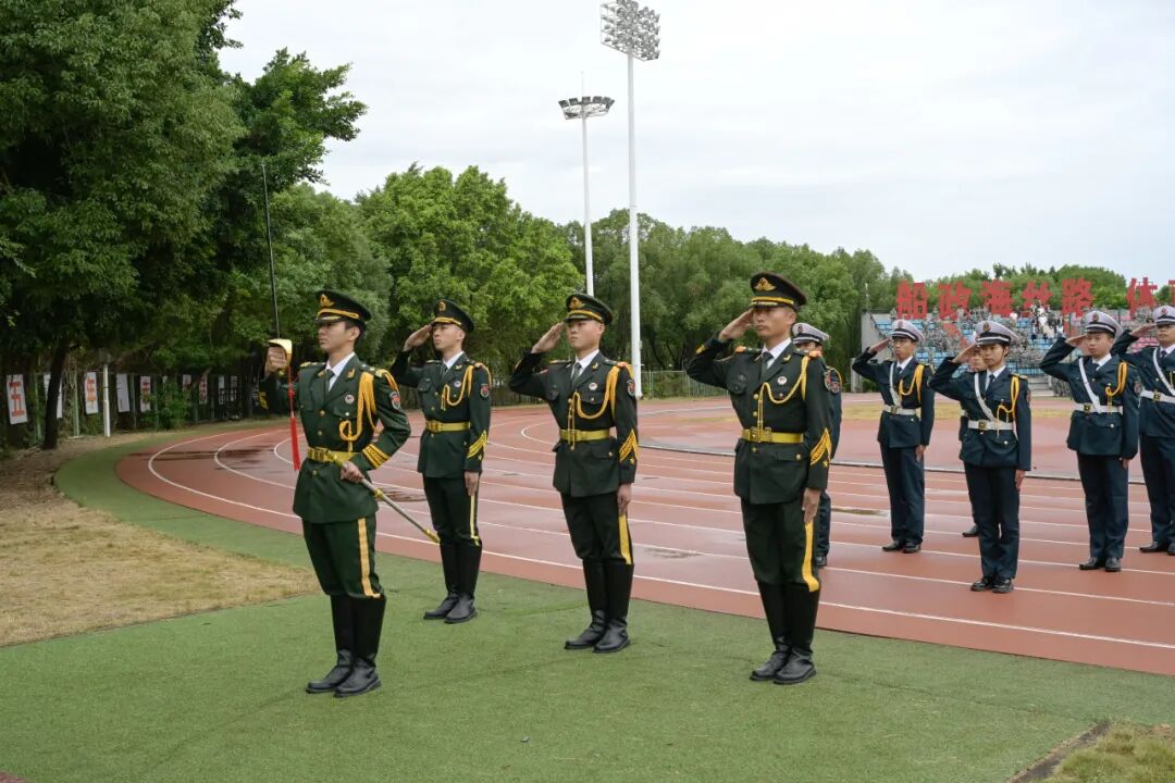 激昂乐曲中,分列式方队铿锵登场。每一步掷地有声,每一声口号震彻云霄,整齐划一的动作里,藏着无数次磨合的默契,更绽放着船政少年的蓬勃朝气