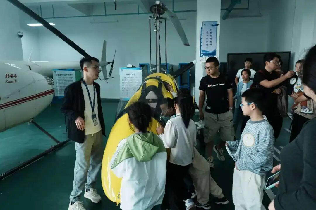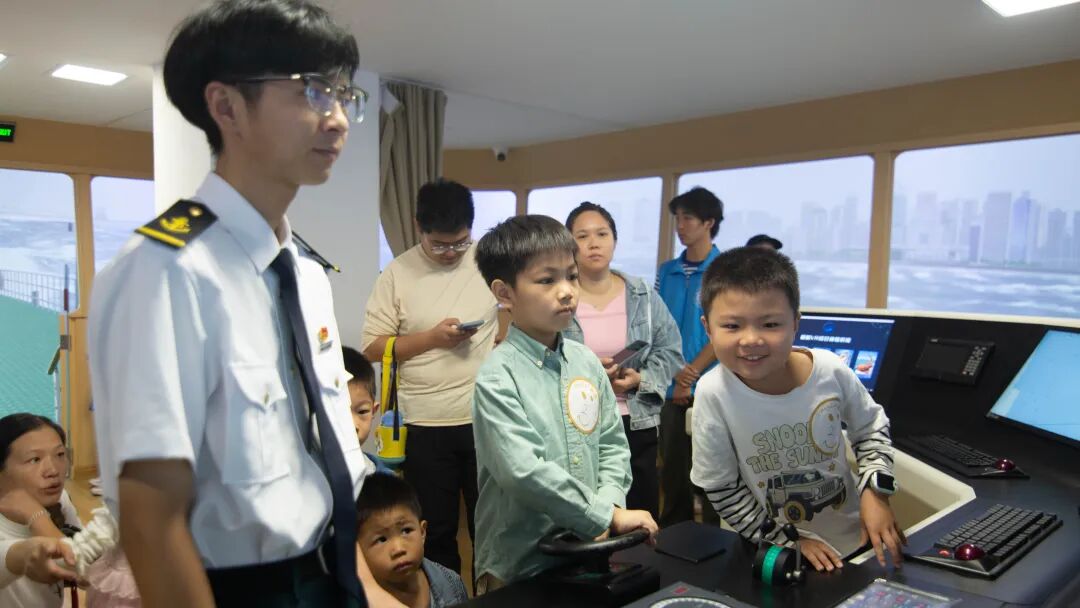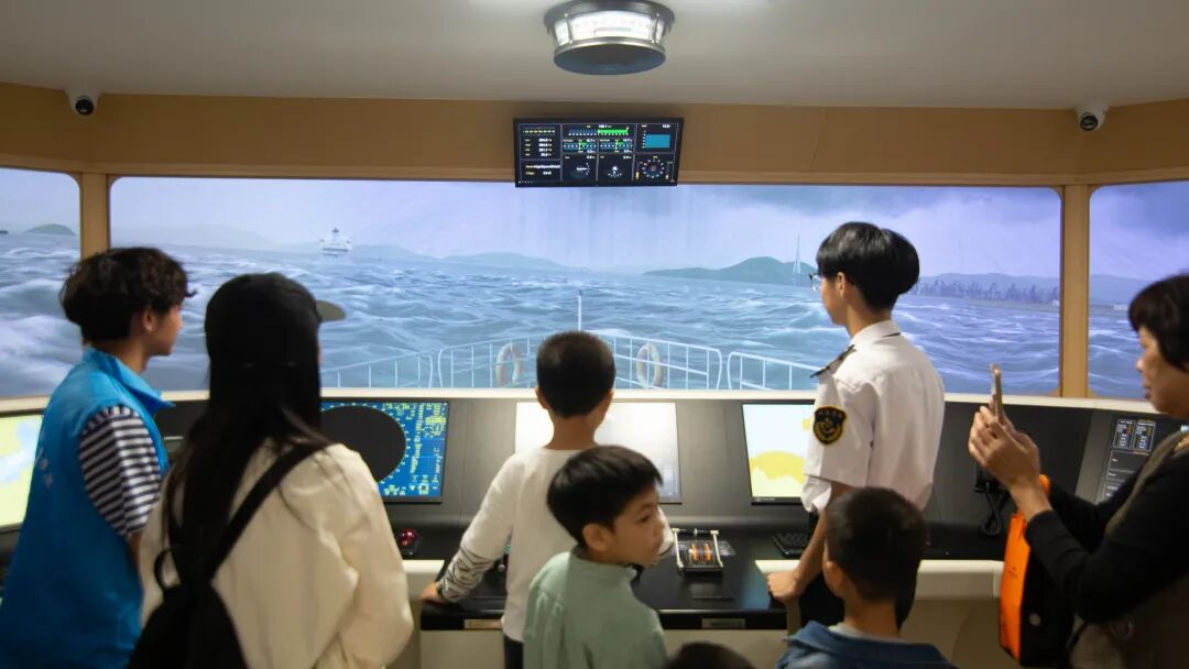 在航海实训基地,在航海学院教师的专业指导下,家长与孩子一同借助航海模拟器实操,系统了解不同船型操纵特性、船舶避碰规则、航线规划设计及航海仪器应用等核心知识;携手登临退役舰艇,沉浸式追溯人民海军舰艇的发展历程;共同聆听福船文化专题讲解,走进海洋航行器创研工坊,深入探寻中国古代船舶技术精粹与古福船文化内涵。