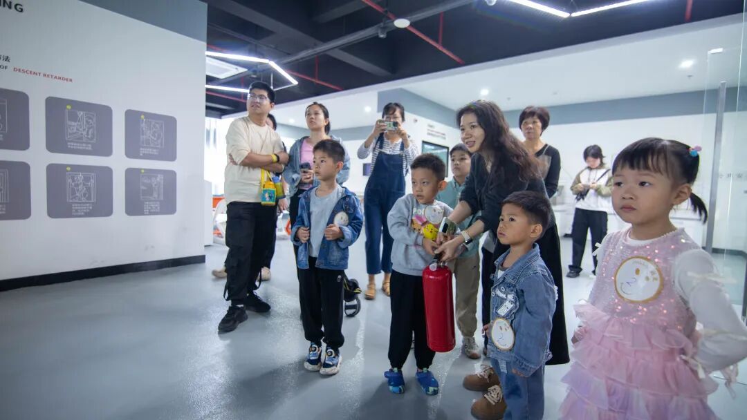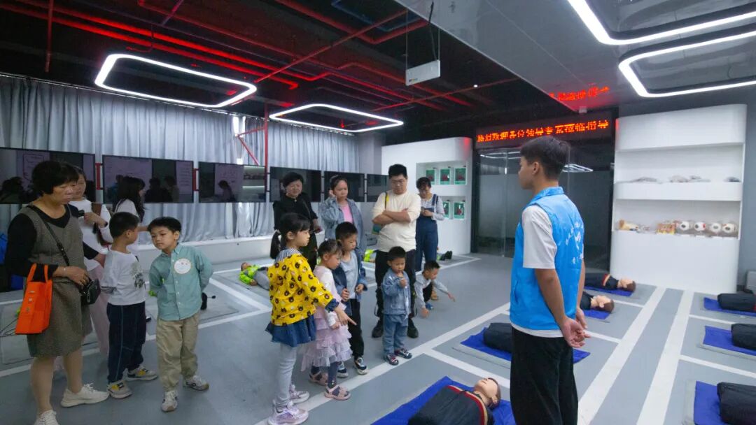 公共安全产教融合实训基地内,家长和孩子实地探访,了解火灾、台风、地震、电梯坠落、交通事故等生活中可能出现的意外场景。通过观看粉尘爆炸实验与建筑消防系统演示,家长与孩子共同掌握燃烧与爆炸的基本原理及防范措施。在安全与环境学院老师的指导下,家长和孩子携手学习快速穿戴防毒面罩、火场逃生技巧及创伤包扎救护技术,熟悉创伤包扎工具的使用方法,完成相关操作练习。