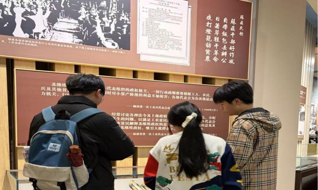 随后,实践队前往福建省革命历史纪念馆。队员们循着八闽革命的历史脉络缓步前行,在一个个陈列展区前驻足凝望。泛黄的老照片、斑驳的革命文物、生动的场景复原与翔实的文字史料,将福建人民从鸦片战争后的不屈抗争,到土地革命时期苏区创建、长征路上浴血奋战,再到福州解放的峥嵘岁月徐徐铺展。叶飞将军体内留存数十年的子弹头、苏区军民用过的旧农具、战时传递情报的密信,一件件珍贵展品让尘封的历史变得鲜活,队员们在驻足聆听与凝神细看间,真切感悟着八闽儿女坚韧不拔、前仆后继的革命奋斗精神,深刻体会到红色江山的来之不易。