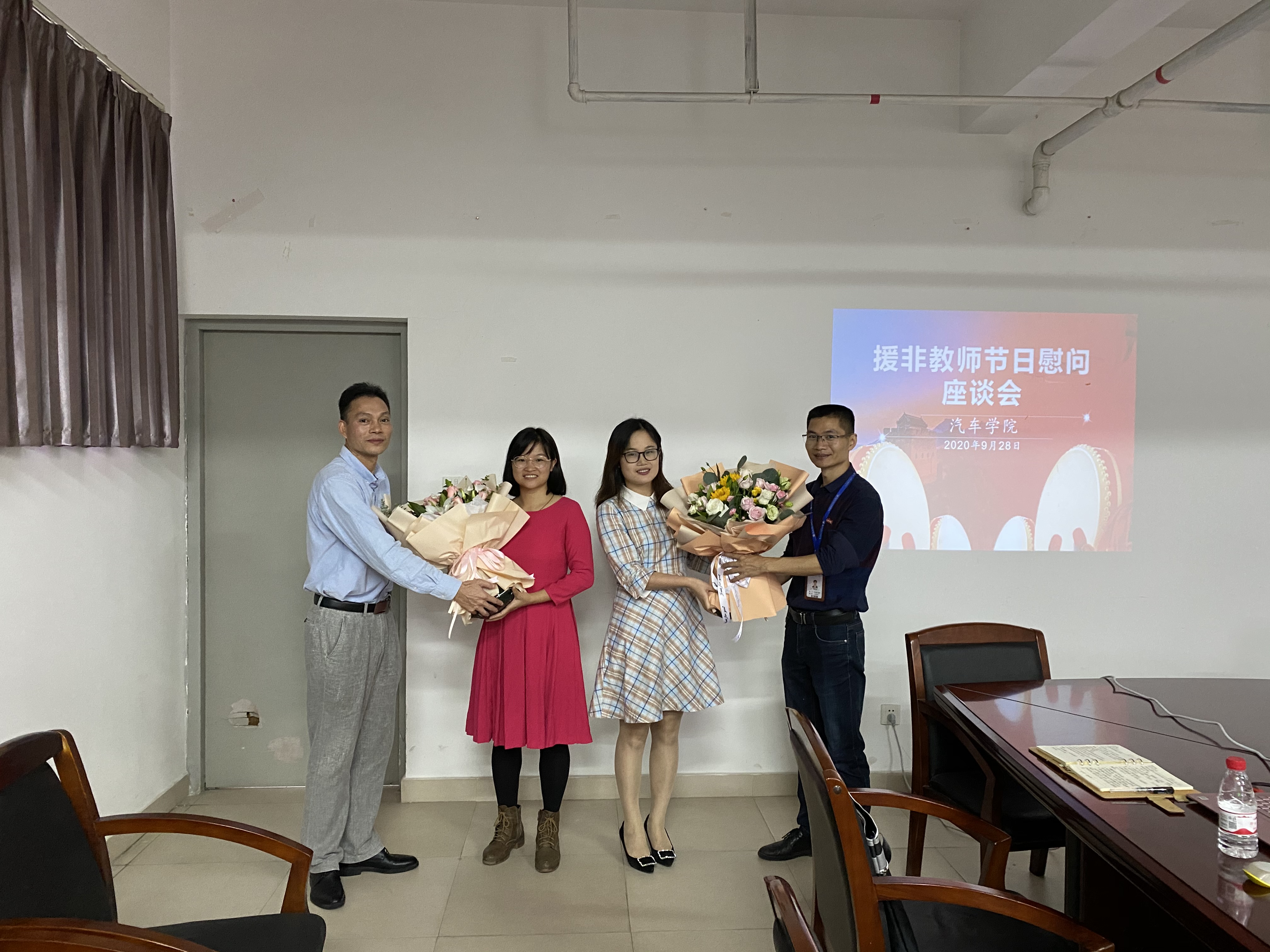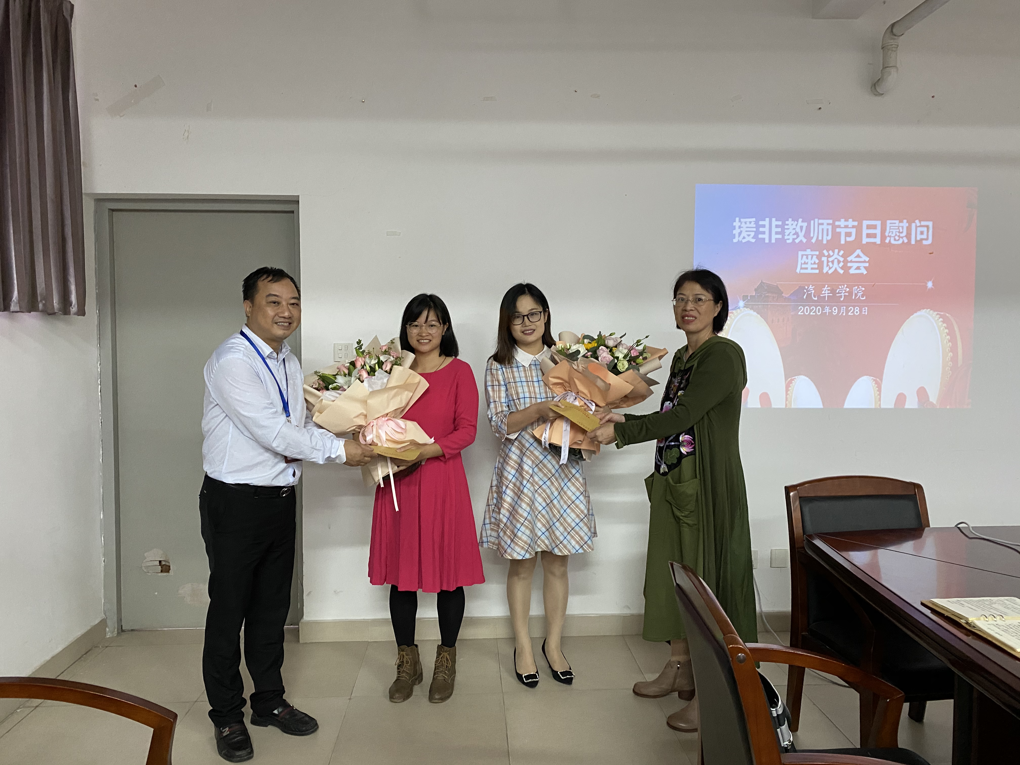 汽车学院党政领导蔡华锦、苏庆列给援非教师家属代表献上鲜花,对外交流中心和工会代表伍小明、徐芬给援非教师家属代表颁发节日慰问金。代表学校给予援非教师们最热烈的节日祝贺和亲切的节日慰问。